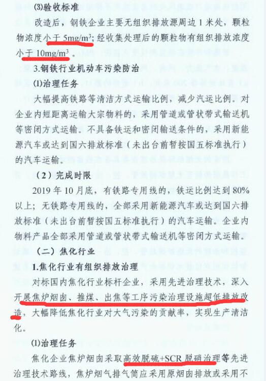 1、2019年6月底前,完成煉鐵、煉鋼等工序的超低排放改造;2019年10月底前,完成燒結機頭(球團焙燒)的超低排放改造。