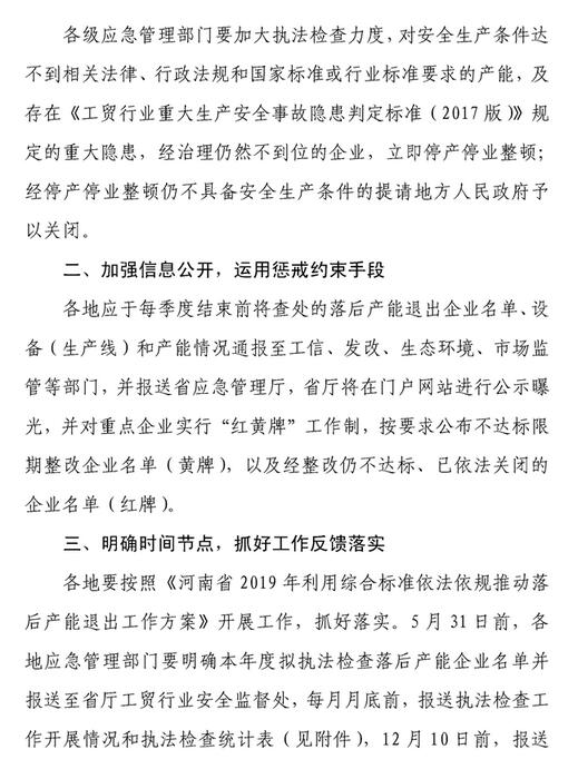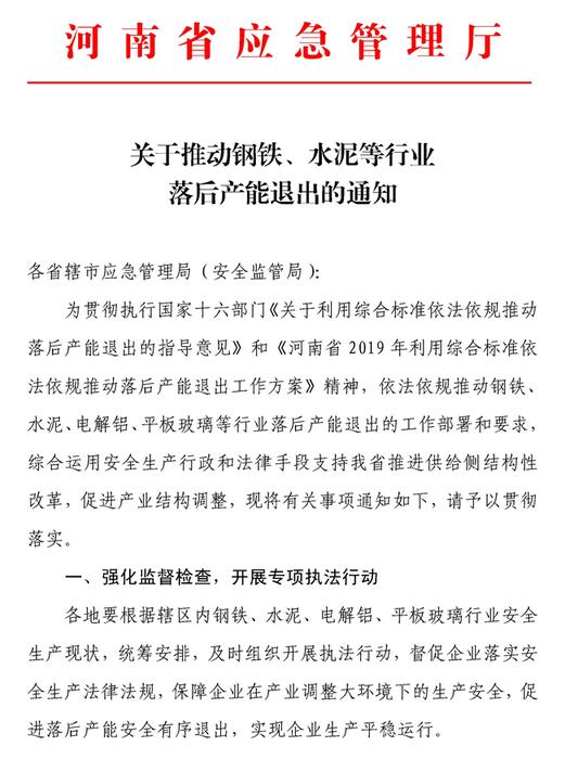 4月25日,河南省應急管理廳下發《關于推動鋼鐵、水泥等行業落后產能退出的通知》。《通知》明確表示將利用安全生產行政和法律手段推進水泥、鋼鐵等行業落后產能退出。《通知》要求各級應急管理部門要加大執法檢查力度,對安全生產條件達不到相關法律、行政法規和國家標準或行業標準要求的產能,及存在《工貿行業重大生產安全事故隱患判定標準(2017版)》規定的重大隱患,經治理仍然不到位的企業,立即停業停產整頓;經停業停產整頓仍不具備安全生產條件的提請地方人民政府予以關閉。