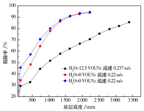 在煙氣含水蒸汽12.5%、氨水濃度飽和的條件下,采用滿足指標要求的活性炭,當床層高度超過3m時,NOx脫除率超過80%,如圖4所示。