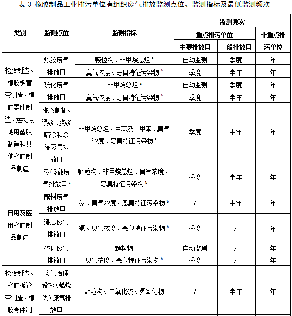 5.2.1.2橡膠制品工業排污單位有組織廢氣排放監測點位、監測指標及最低監測頻次按照表3執行。