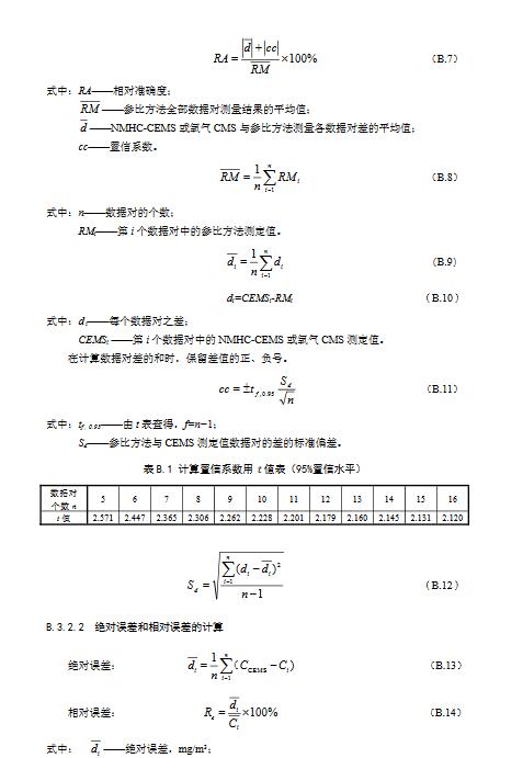 3.10相對準確度Relativeaccuracy采用參比方法與NMHC-CEMS同步測定廢氣中氣態污染物濃度,取同時間區間且相同狀態測量結果組成若干數據對,數據對之差平均值的絕對值與置信系數之和與參比方法測定數據的平均值之比。