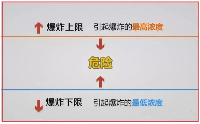 例如常見的VOC:苯,其與空氣混合的爆炸極限為1.5%~9.5%,前后兩個數字分別稱為爆炸下限和爆炸上限,這兩者有時亦稱為著火下限和著火上限。在低于爆炸下限時不爆炸也不著火;在高于爆炸上限時不會爆炸,但能燃燒。