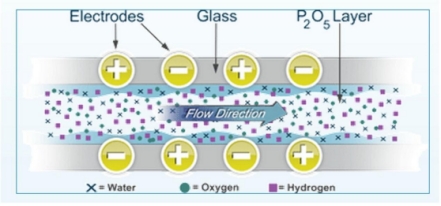 基本原理:傳感器采用五氧化二磷電解法原理,此傳感器由一個(gè)玻璃材質(zhì)的圓柱和兩根并行的電極(通常由鉑或銠金屬絲制成)組成,并在兩根電極之間涂有很薄的一層磷酸膜層。在兩電極間施加一直流電壓,氣體中的水分被作為吸濕劑的五氧化二磷膜層連續(xù)吸收,生成磷酸,并被電解為氫和氧,同時(shí)五氧化二磷得以再生。通過連續(xù)的電解過程,在樣氣的水分含量與電解后的水分之間建立平衡,電解電流與樣氣中水分含量成比例。